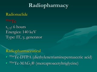This document outlines the procedure and indications for a renal scan using radiopharmaceuticals such as Tc-99m DTPA or Tc-99m MAG3 to evaluate renal function, perfusion, and obstruction by analyzing renogram curves, effective renal plasma flow, glomerular filtration rate, and response to diuretics or captopril. The scan involves intravenous injection of the radiotracer and imaging the kidneys over time to assess renal anatomy, function, blood flow, and response to pharmacological challenges. Contraindications include recent iodine contrast or medications that could interfere with the pharmacologic challenges used in the test