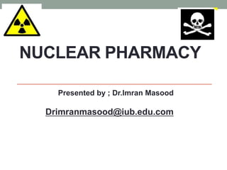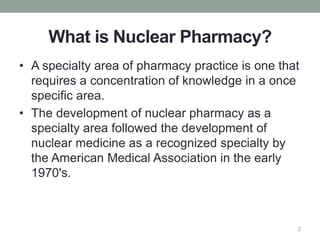 Nuclear pharmacy is a specialty area of pharmacy practice that requires expertise in radiopharmaceuticals for nuclear medicine procedures. Nuclear pharmacists work in hospitals, pharmacies, academia, and research to prepare, dispense, and quality test radiopharmaceuticals used for diagnostic imaging and cancer treatment. They must receive specialized training in a nuclear pharmacy program and certification as a Board Certified Nuclear Pharmacist. Nuclear pharmacies must be properly designed and operated to safely handle radioactive materials, with adequate shielding, quality control testing, storage, dispensing, and waste disposal procedures to protect personnel.