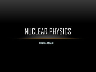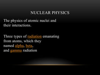 The document discusses nuclear physics, focusing on the properties and interactions of atomic nuclei, including types of radiation (alpha, beta, gamma) and their applications. It explains radioactive decay, the instability of isotopes, and their implications for nuclear power and medicine. Additionally, it highlights the health risks associated with different types of radiation, particularly gamma rays, while noting the limited availability and challenges of using uranium as a power source.