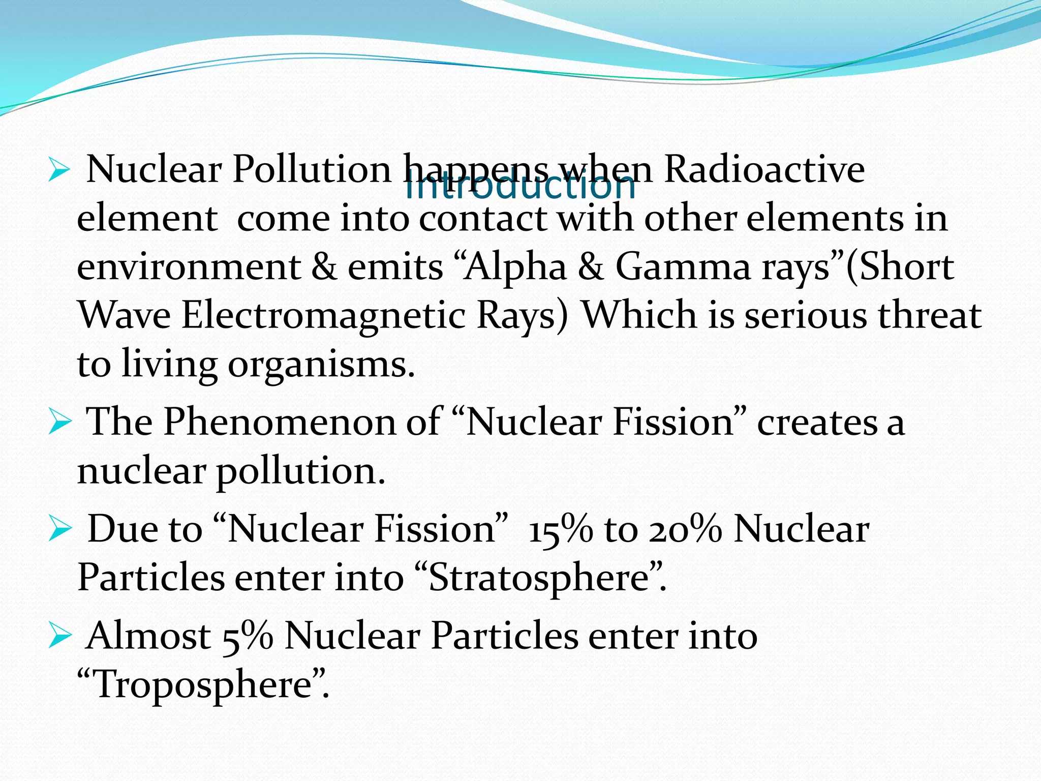 This document discusses nuclear pollution from radioactive elements released during nuclear fission. Nuclear pollution can come from nuclear power plants, experiments, transportation, weapons, and accidents. It affects living organisms by causing diseases like skin conditions and damage to reproductive organs. Proper maintenance of nuclear facilities, safe transportation, storage of waste, and limiting nuclear activities can help control and reduce nuclear pollution. As an example, the 1986 Chernobyl disaster in the Soviet Union dispersed radioactive materials into the atmosphere during a safety test, contaminating a large area.