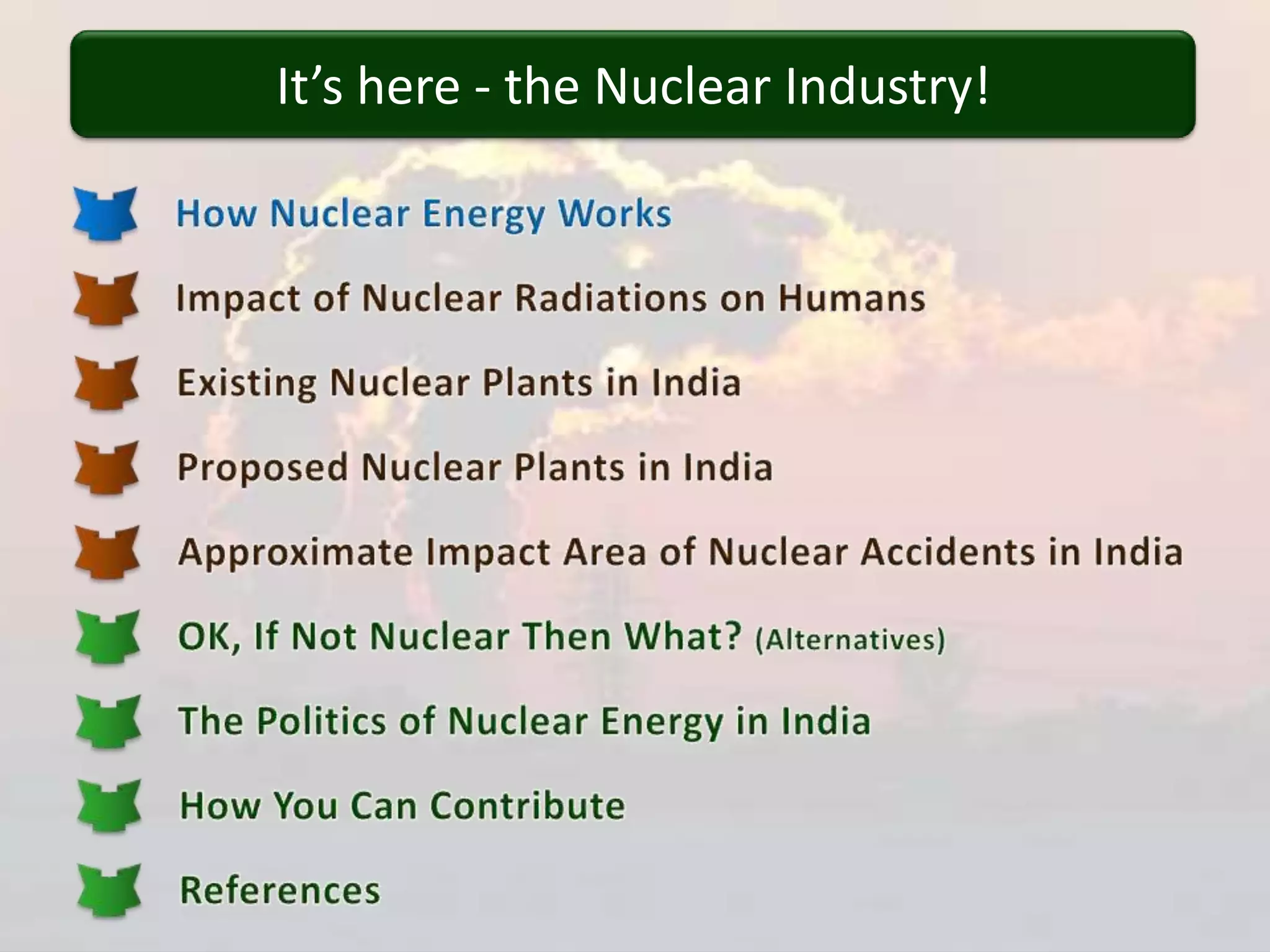 The document discusses the risks of nuclear energy at each stage from mining to waste disposal. It notes that radiation levels increase significantly at each stage and waste has no solution. Areas around nuclear facilities become contaminated and waste remains toxic for thousands of years. Nuclear accidents can make vast areas uninhabitable for decades and impact vegetation, animals, and human health through increased cancer rates and birth defects. Alternative energy sources like efficiency improvements and renewables are presented as safer and less costly options that could meet India's energy needs without the risks of nuclear power.