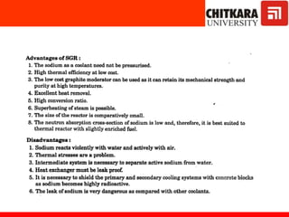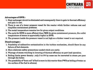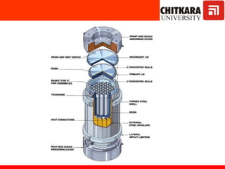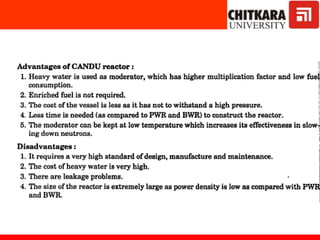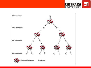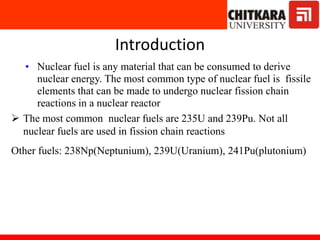 The document discusses nuclear fuels used in nuclear power plants such as uranium-235 and plutonium-239, how nuclear fission produces energy through a self-sustaining chain reaction, and the key components of nuclear reactors including the reactor core, control rods, moderator, coolant, and safety measures. It also covers different types of nuclear reactors like pressurized water reactors and boiling water reactors, as well as waste disposal and the future prospects of nuclear power.