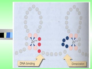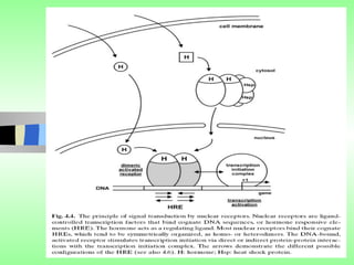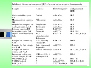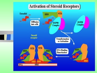 Nuclear receptors regulate gene expression by binding to ligands that pass through the cell membrane via simple diffusion. These receptors are located in the cytoplasm or nucleus and bind small molecule ligands like steroids, lipids, vitamins, and thyroid hormone to function as transcriptional coactivators. Nuclear receptor ligands come in various structures including steroids like estrogen, progesterone, and androgen as well as non-steroidal lipophilic hormones such as vitamin D, retinoic acid, fatty acids, and thyroid hormone. Some receptors have unknown ligands and are called "orphan" receptors. Steroid receptors differ from peptide receptors in their half-life, speed of action, duration of effect, location, and degree of post-receptor regulation