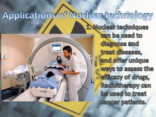 Nuclear power generates electricity through nuclear reactions that produce heat, which is commonly used to power steam turbines. It involves nuclear fission, decay, and fusion processes that primarily use elements in the actinide series. Nuclear power is considered a key future energy source and emission-free alternative, with over 440 reactors currently operating in 31 countries around the world.