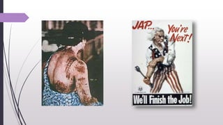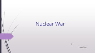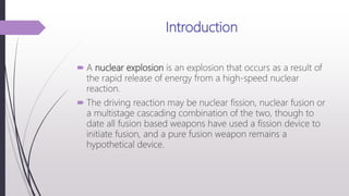 The document summarizes the history of nuclear weapons, including their effects and key events. It describes the atomic bombings of Hiroshima and Nagasaki by the United States in August 1945, which represented the first and only use of nuclear weapons in warfare. Over 200,000 people were killed in the initial months after the bombings from injuries and radiation sickness. The bombings contributed to Japan's surrender and the end of World War II, though their justification remains debated.