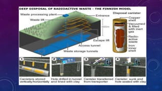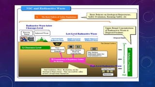 This document discusses nuclear waste disposal and procedures for removing radioactive waste. It describes the three categories of nuclear waste - high, intermediate, and low-level waste - and explains that high-level waste produces 95% of radiation. Procedures for disposal include deep geological disposal of high-level waste and surface or near-surface disposal of intermediate and low-level waste. The document also discusses new methods for removing radioactivity, such as the Notre Dame Thorium Borate-1 compound and sulfide sponges. Effectiveness of disposal procedures depends on continued development of faster and more effective radioactive waste removal techniques.