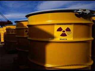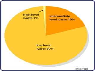 Nuclear waste is categorized into three levels based on radioactivity. Very low-level waste contains very low concentrations and includes materials from medical and research facilities. Low and intermediate waste contains higher concentrations. High level waste produces heat and contains long-lived radionuclides. The waste comes from nuclear power plants, research reactors, nuclear medicine and weapons production.