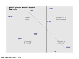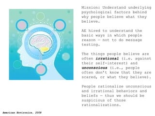 The document summarizes research on how Americans reason about issues related to nuclear disarmament, terrorism, and national security. Key findings include that linking terrorism and nuclear weapons increases mortality salience and support for preemptive war, and that people view deterrence as possible with countries like North Korea but not Iran due to perceptions of their leaders. Recommendations include not linking terrorism and nuclear weapons when discussing disarmament issues.