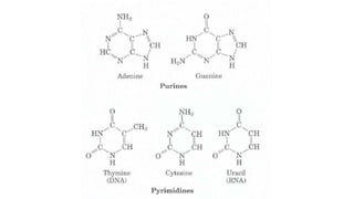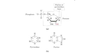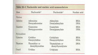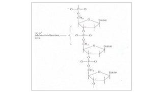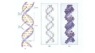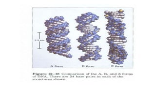 This document provides information about DNA and nucleic acids. It defines DNA as deoxyribose nucleic acid and notes its location in the nucleus and mitochondria of cells. It describes DNA as being tightly packaged into chromosomes within the nucleus. It also outlines the basic components of nucleic acids, including sugars, phosphates, and nitrogenous bases, and describes how nucleotides are formed from nucleosides through phosphodiester linkages to form nucleic acid polymers. Finally, it compares the A, B, and Z forms of DNA based on parameters like helix sense, base pairs per turn, and diameter.