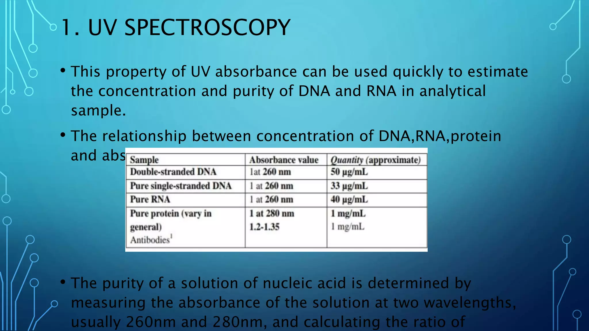1. UV spectroscopy can be used to estimate the concentration and purity of DNA and RNA samples by measuring absorbance at 260nm and 280nm. Ratios below 1.8 indicate contamination.