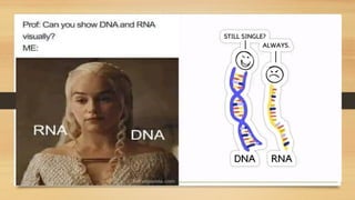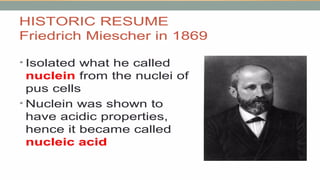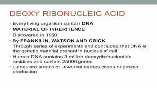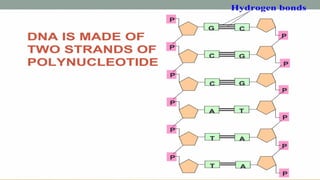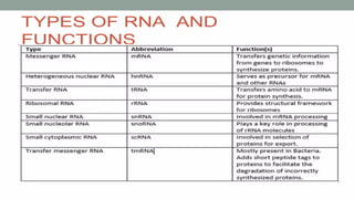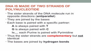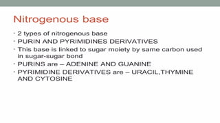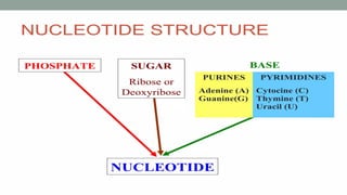 Nucleic acids are large polymers made of nucleotides, which serve as their building blocks. There are two main types: DNA, which carries genetic information and is found in chromosomes, and RNA, which is involved in protein synthesis and located in the nucleus and cytoplasm. The document also details the base pairing rules for both DNA and RNA, highlighting the differences in their nucleotide compositions.
