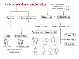 Este documento resume la estructura y función de los ácidos nucleicos. Explica que los nucleótidos son la base de los ácidos nucleicos como el ADN y ARN. El ADN almacena y transmite la información genética en forma de una doble hélice, mientras que el ARN tiene diversas funciones como transportar mensajes para la síntesis de proteínas. La cromatina empaqueta el ADN en la célula gracias a proteínas histonas que permiten su almacenamiento y expresión genética ordenada.