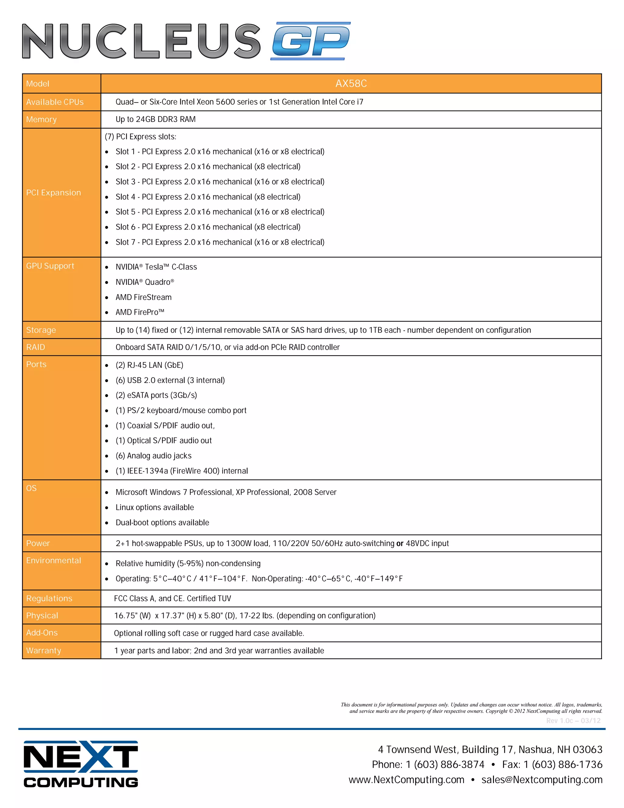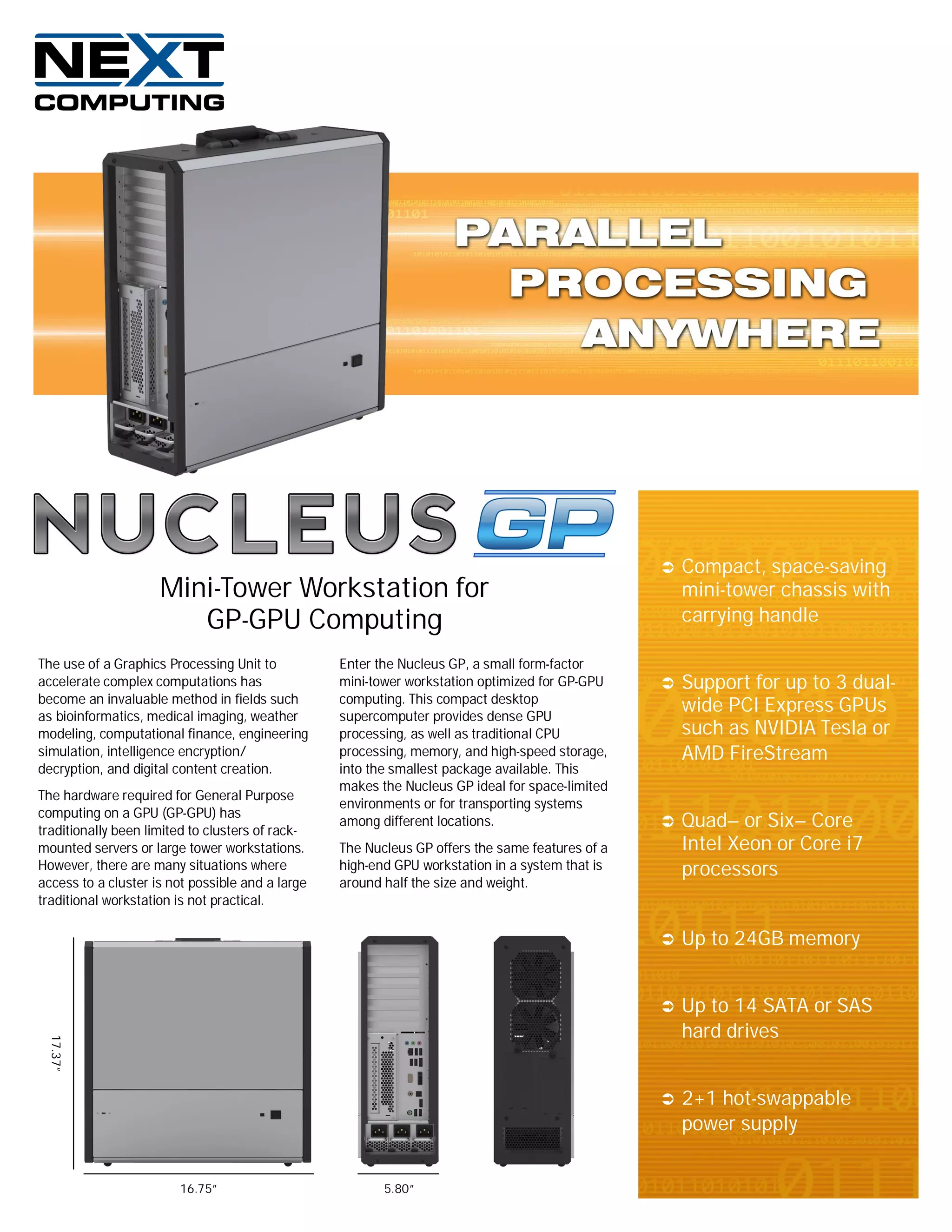 The document describes a compact mini-tower workstation optimized for GPU computing, capable of accommodating high-performance components like NVIDIA Tesla and AMD Firestream GPUs. It supports up to 24GB of memory and multiple SATA or SAS hard drives in a space-efficient design, ideal for environments with limited space. The system is suitable for various demanding applications including bioinformatics, medical imaging, and computational finance, while also offering dual-boot options and a 1-year warranty.