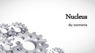 The nucleus is a membrane-bound organelle that contains the genetic material (DNA) of eukaryotic cells. It takes up about 10% of the cell volume and facilitates transcription and replication processes to maintain cell integrity. The nucleus contains nucleoplasm, nucleolus, chromosomes, and a phospholipid bilayer nuclear membrane with pores. It serves as the control center of the cell by synthesizing proteins and controlling traits and metabolism. Chromatin is the complex of DNA and proteins within the nucleus that allows for compaction of DNA.