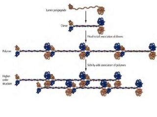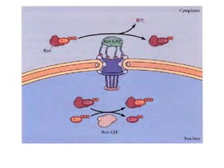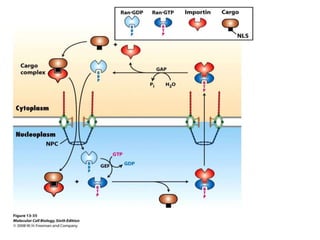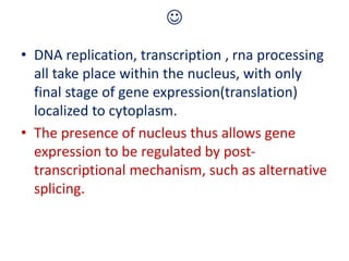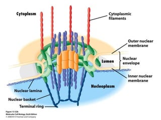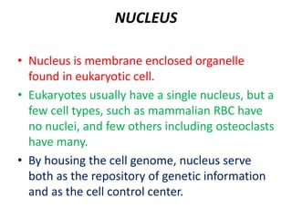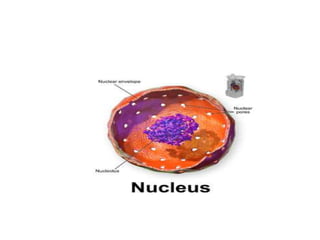 The nucleus is a membrane-bound organelle that houses the cell's genome and controls gene expression. It contains DNA, which is replicated, transcribed into RNA, and processed. The nuclear envelope, made of two membranes, regulates transport of molecules into and out of the nucleus through nuclear pores. Inside the nucleus, DNA is organized into chromatin and packaged into chromosomes. The nucleolus forms around DNA that encodes ribosomal RNA and is the site of ribosome biogenesis.