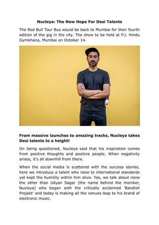 Nucleya, a prominent bass-heavy electronic artist from Ahmedabad, will perform at the Red Bull Tour Bus in Mumbai on October 14, showcasing his dedication to elevating desi talent. He emphasizes the importance of positivity and humility despite his international success, mentioning future projects including a collaboration with Divine for Anurag Kashyap's film 'Mukkabaaz'. Nucleya's innovative approach to music and live performances continues to resonate with fans, reflecting his evolution from local gigs to international stages.