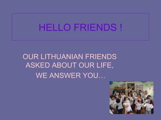 The document consists of questions and responses from friends discussing their lives, holidays, school experiences, and traditional foods. They mention activities such as playing computer games and celebrating birthdays with games. The overall tone is friendly and inviting, with a request for further answers to the posed questions.