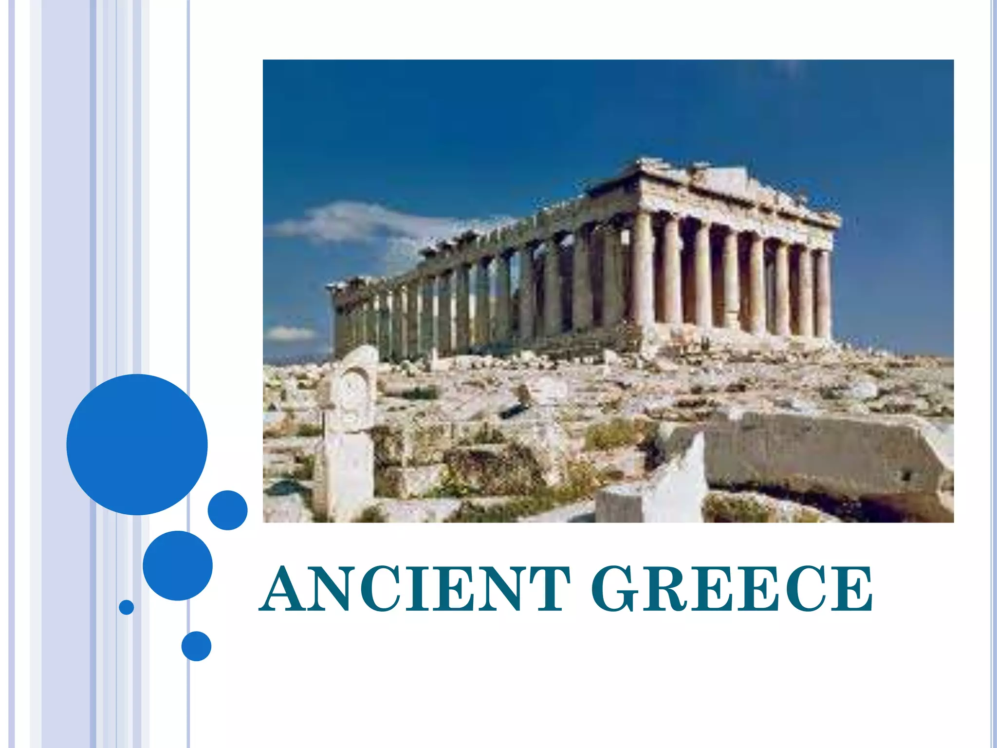 Ancient Greece spanned from the 8th century BC to the 1st century BC in the Mediterranean region. It was composed of city-states called poleis scattered across the Balkan peninsula and islands. The natural environment influenced Greek civilization by facilitating sea trade and isolating the poleis, preventing unification. Though independent, the poleis were united by a common Greek language and religion. Greek culture spread widely and formed the foundations of Western civilization.