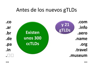 Antes de los nuevos gTLDs, habían unos 300 ccTLDs y 21 gTLDs como .com y .org. ICANN inició el proceso de nuevos gTLDs en 2005, recibiendo 1,930 solicitudes entre 2012-2015. Los nuevos gTLDs incluyen genéricos abiertos como .app, cerrados para una industria como .hotel, y geográficos como .london. El Trademark Clearinghouse protege marcas registradas en los nuevos gTLDs.