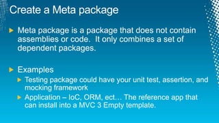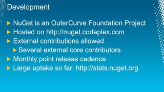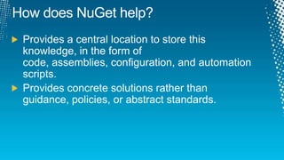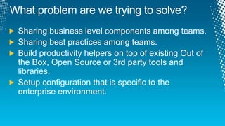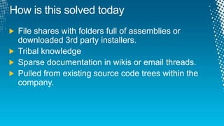 The document discusses making open source software easy to use in projects by automatically extracting dependencies and configuring them. It suggests starting with a search online to find the correct dependencies and then extracting the assemblies to the solution directory while also adding the proper configuration to the web.config file. The document then discusses opportunities to expand this approach to help more developers and enterprises easily incorporate open source software into their projects.