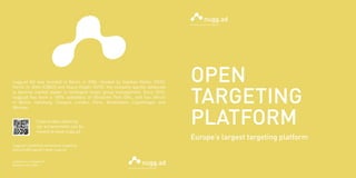 The document describes Europe's largest targeting platform that allows media agencies, publishers, and external data sources to network their targeting campaigns across multiple publishers. It offers cross-publisher campaigns aimed at precise target groups with optimal infrastructure for branding campaigns. Campaigns can be planned with single parameters and include global frequency capping and boosting to optimize advertising contact while maintaining transparency and control for agencies.