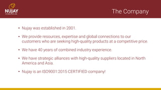 Nujay was established in 2001 to provide printed circuit boards (PCBs) and liquid crystal displays (LCDs) to customers. It has 40 years of combined industry experience and certifications in quality management. Nujay works with suppliers in North America and Asia to offer customers competitive pricing, quality inspection, and supply chain management for their PCB and LCD needs.