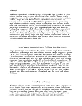 Radioterapi adalah penggunaan radiasi pengion untuk mematikan sel kanker dan mengobati pasien dengan berbagai teknik seperti teleterapi dan brakiterapi."