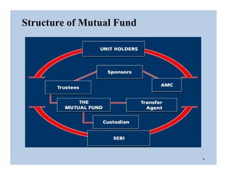 The document discusses the structure and legal environment of mutual funds in India. It describes the key constituents of a mutual fund which follow a 3-tier structure including sponsors, trustees, asset management companies (AMCs), custodians and other service providers. The roles and responsibilities of each constituent are explained. Regulatory authorities that oversee mutual funds like SEBI, RBI and AMFI are also summarized along with their functions. The grievance redressal process for investors is outlined.