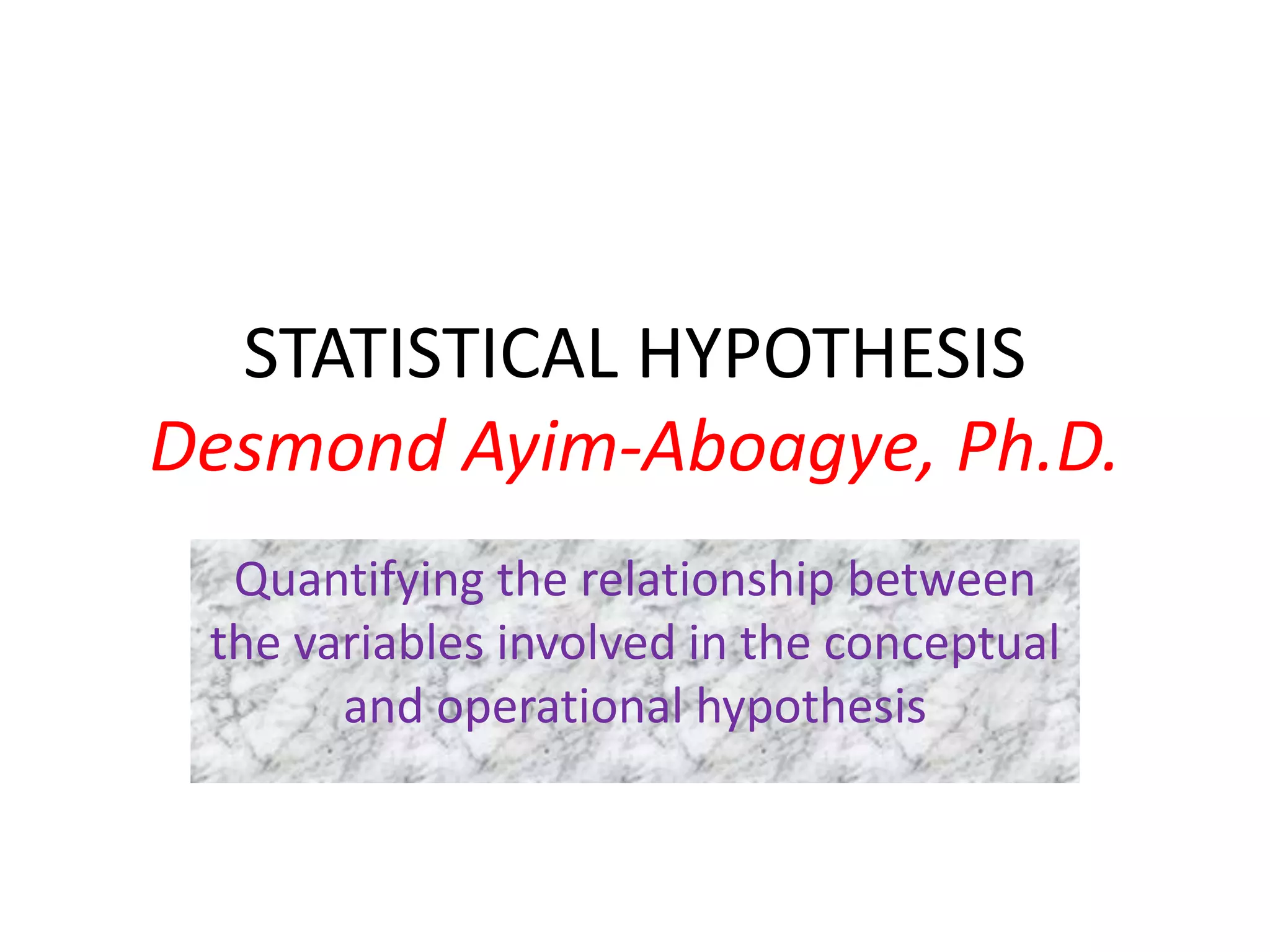 1. A statistical hypothesis represents the mathematical relationship between two or more population parameters. It can be directional, specifying the exact relationship, or nondirectional, anticipating a difference but not specifying the direction.