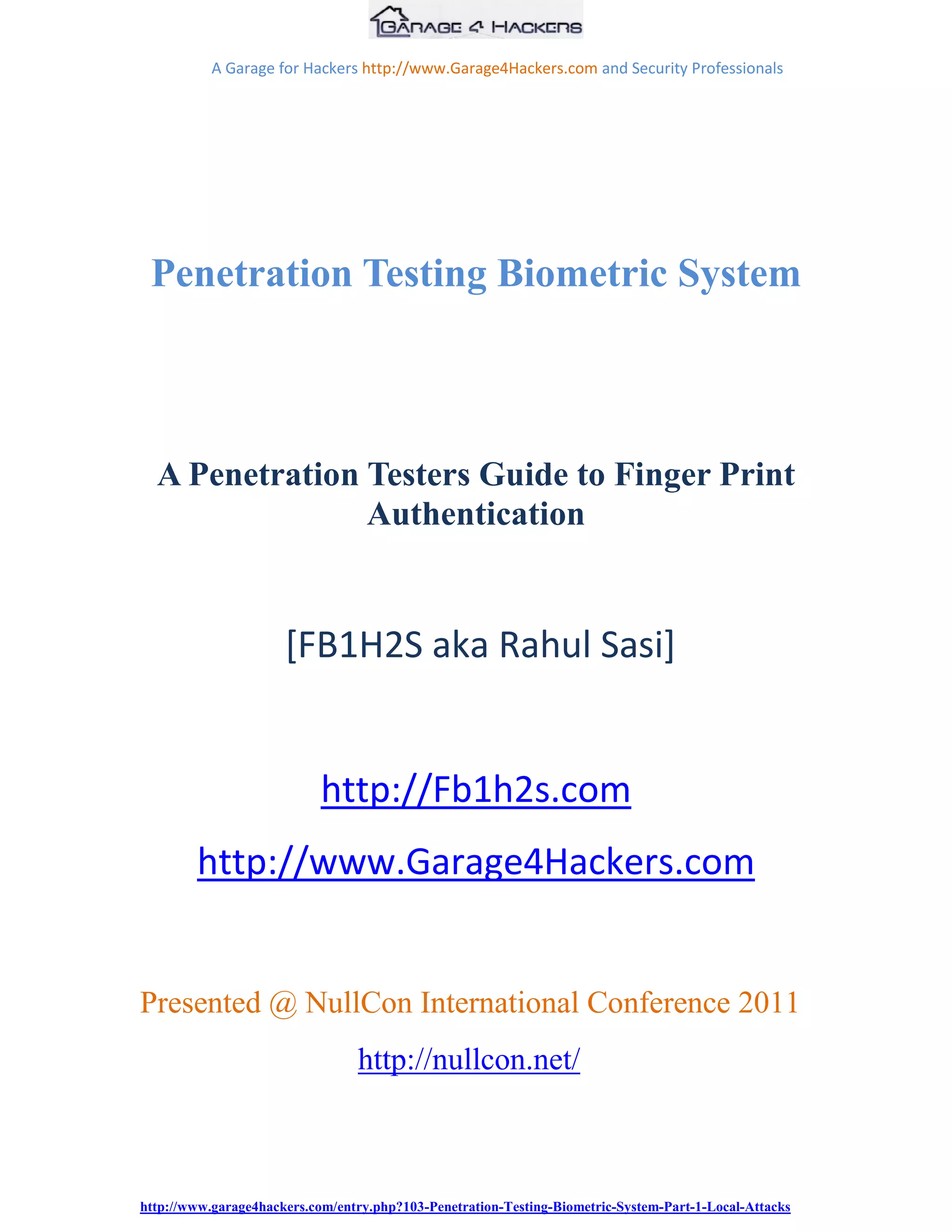 The document provides guidance on penetration testing biometric fingerprint authentication systems. It outlines various potential attack vectors, including local attacks on the fingerprint sensor and USB data manager, as well as remote attacks on the remote IP management, backend database, and fingerprint manager admin interface. The document then details methods for conducting local attacks, such as using a fingerprint logger to steal a print and reproducing fake fingerprints to trick the sensor. It also discusses vulnerabilities in biometric device network protocols and remote administration capabilities. The goal is to evaluate security and identify ways to bypass authentication or steal sensitive user data from biometric systems.