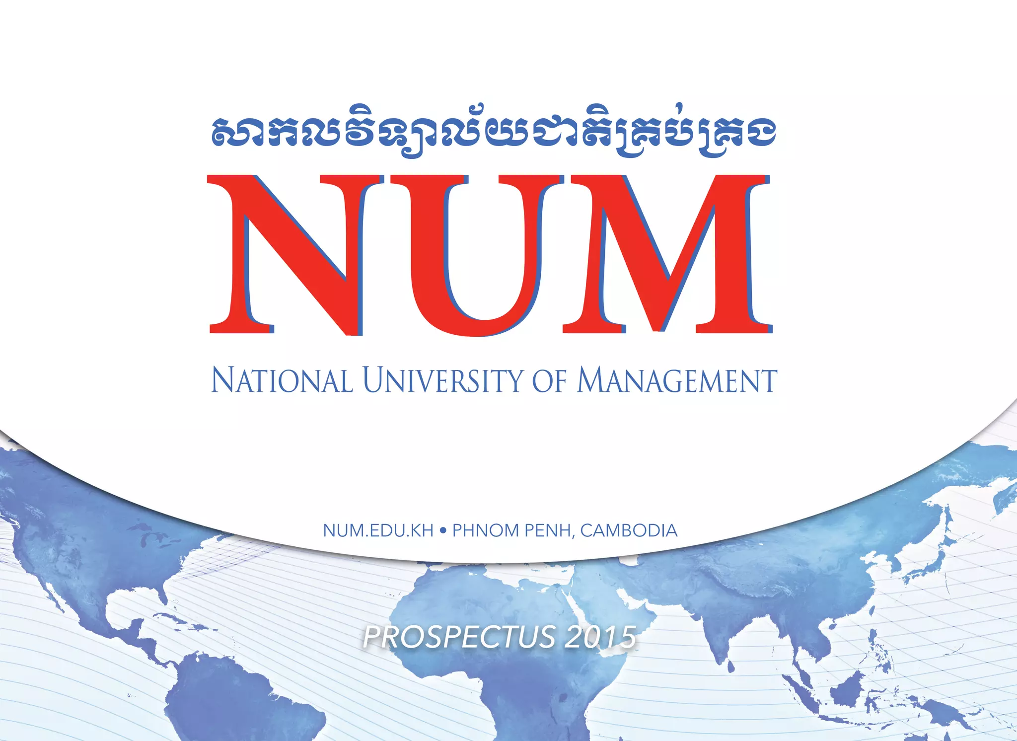 The document is a prospectus for the National University of Management (NUM) in Cambodia for 2015. It provides information about NUM's history, vision, faculties, programs, facilities, partnerships and leadership. NUM was founded in 1983 and has grown to become one of Cambodia's leading public universities with over 14,000 students studying across its seven faculties and graduate programs. The prospectus outlines NUM's commitment to excellence in academics, research, and innovation to prepare students for the job market.