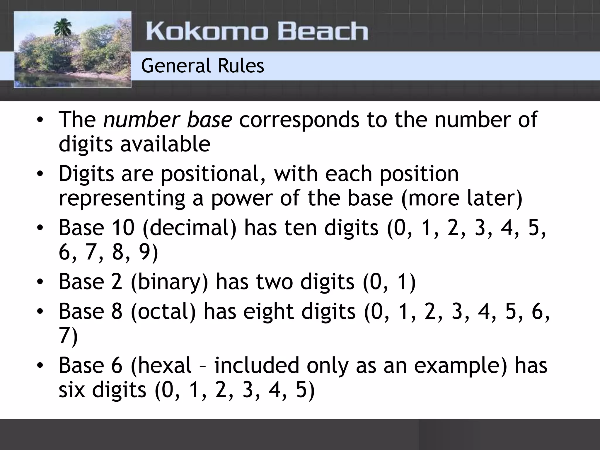 This document discusses number base conversions and the rules for different number bases. It begins by explaining that number bases correspond to the number of available digits, with digits representing powers of the base. It then provides examples of counting in binary, octal, decimal, and hexadecimal. The document demonstrates how to convert numbers between these bases by determining the place value of each digit. It also explains how shorthand notations like hexadecimal are possible due to exponential correlations between powers of 2, 8, and 16.