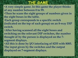 This document describes a number guessing game that uses an 8085 microprocessor and 8255 I/O interface chip. The game allows a player to think of a number between 0 and 99, then scan a table to determine which DIP switches to flip on an 8-way switch in order to display the chosen number on 7-segment displays. The 8255 chip interfaces between the 8085 and the switches and displays, reading the switch input and controlling the display output.