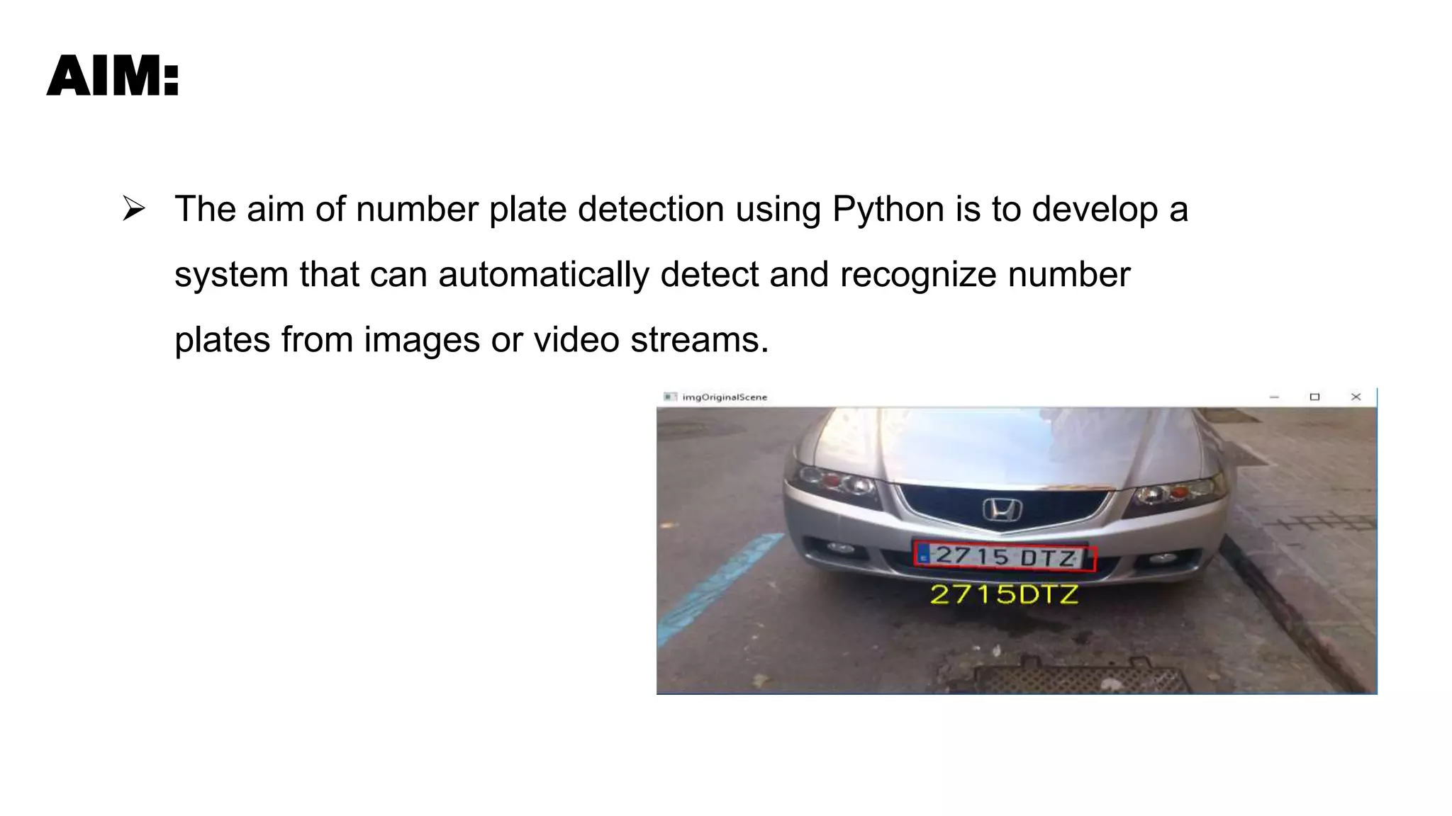 The document outlines a system to automatically detect and recognize vehicle license plates from images or video streams. The system aims to extract the license plate region, preprocess the image, perform optical character recognition to recognize the characters, record the date and time, and store the results in a CSV file. It describes the workflow which includes loading an image, extracting the license plate, preprocessing the image, recognizing characters with OCR, retrieving the date and time, and storing the results in a CSV file to process multiple images.