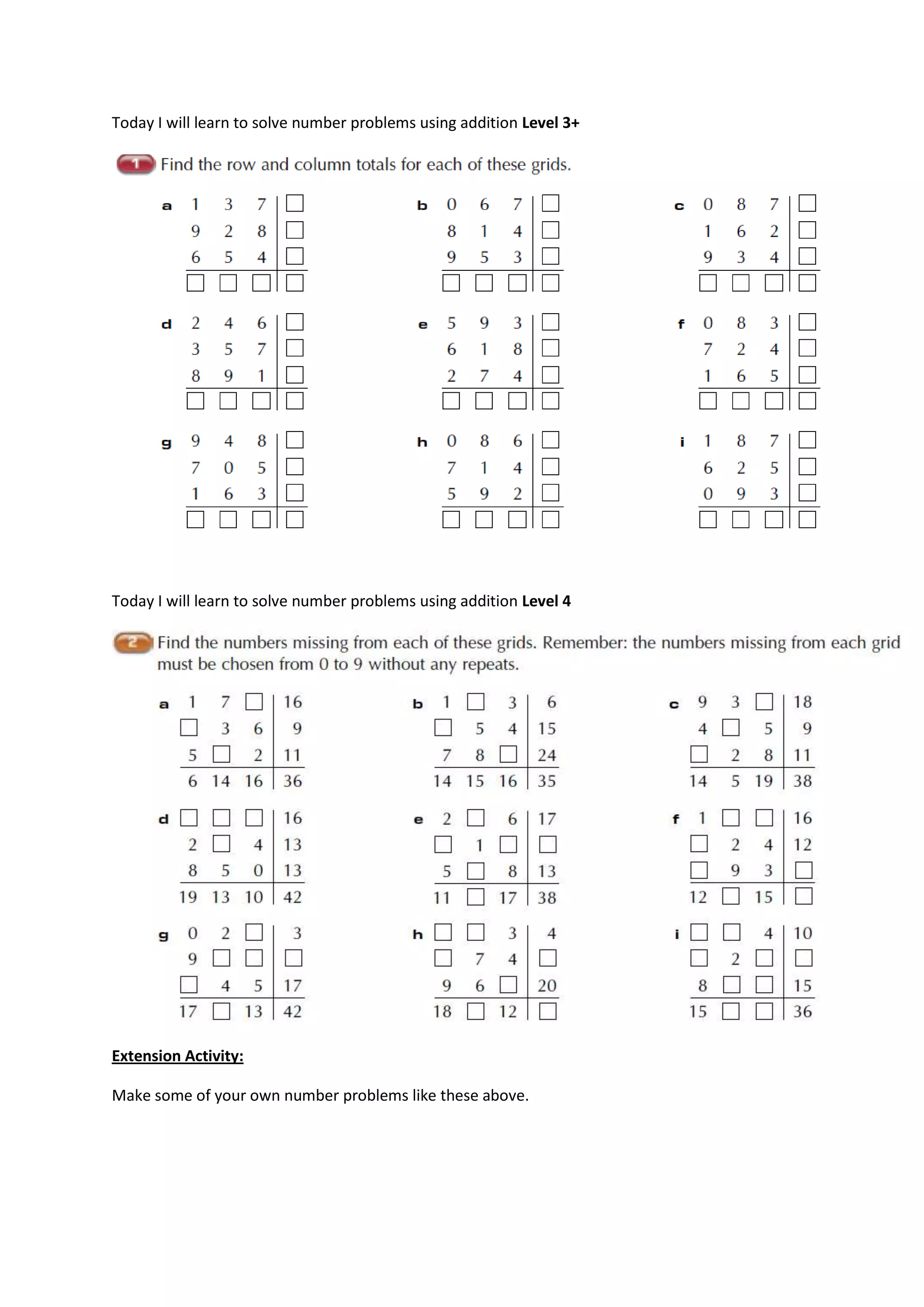 The document discusses learning to solve addition problems at a Level 3+ and Level 4, and includes an extension activity to make your own addition problems.