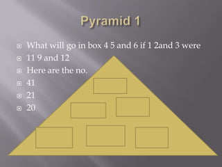 This document describes three number pyramid puzzles where the values in boxes 4, 5, and 6 are calculated based on the values in boxes 1, 2, and 3. It then presents a story where solving the third puzzle awakens a mummy, causing the player to flee the tomb in a panic, scattering the money rewards. Upon safely escaping, the player reflects that life is more important than money.