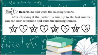 The document discusses determining missing terms in number sequences. It provides examples of number sequences with missing terms and the steps to find the patterns and fill in the blanks. These include looking for the pattern in the existing terms, testing the pattern, and determining the missing terms based on the pattern. Finding patterns in numbers and sequences is an important part of mathematics.