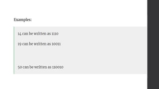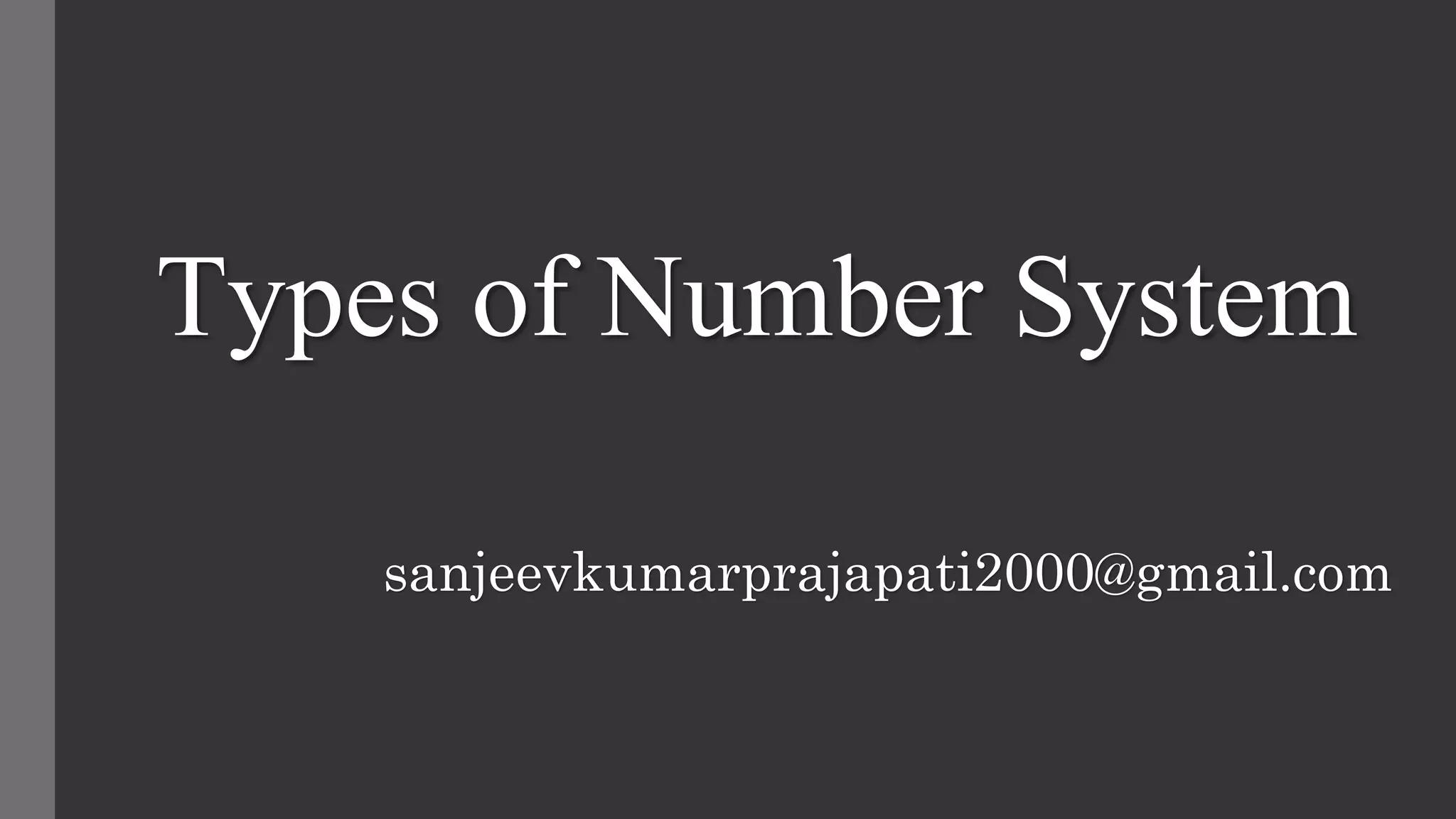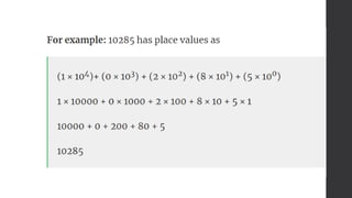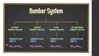 The document explains the concept of number systems, which are methods of representing numbers on a number line using symbols and rules. It details four common types: decimal (base 10), binary (base 2), octal (base 8), and hexadecimal (base 16), highlighting their respective uses and characteristics. Each system consists of specific digits and place values that shape how numbers are constructed and utilized in various applications, including computing.
