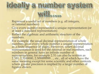 The document discusses the history and development of numeral systems. It notes that the most commonly used system today, using the digits 0-9, was developed in India by mathematicians like Aryabhata and Brahmagupta. This Hindu-Arabic numeral system later spread to the Middle East via Arab traders and was modified before being adopted in Europe. Key aspects included the development of place-value notation and the introduction of the zero symbol. This system is now used globally due to its simplicity compared to earlier additive systems.