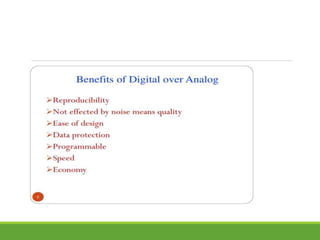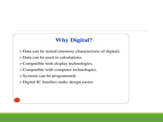 This document provides an overview of digital electronics and number systems. It discusses common number systems like decimal, binary, octal and hexadecimal. It then covers techniques for converting between these different number systems, including dividing or multiplying by the base to get place values. Binary operations like addition and multiplication are also explained. Fractions in different number systems are described at the end.