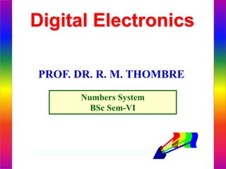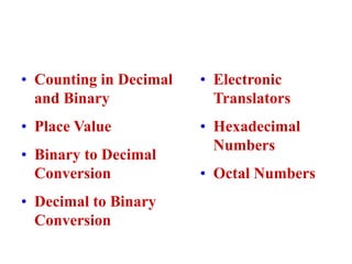 Digital Electronics discusses different number systems including binary, decimal, hexadecimal, and octal. It explains how to convert between these number systems using various methods like place value, division, and electronic translators. Electronic encoders and decoders are integrated circuits that can translate between binary and decimal representations.