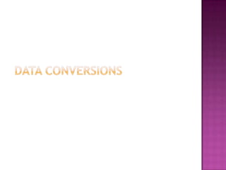 The document discusses different number systems including decimal, binary, octal, and hexadecimal. It provides details on the base and digits used for each system. The decimal system uses base 10 and digits 0-9, binary uses base 2 and digits 0-1. Octal uses base 8 and digits 0-7, with the first digit being 0. Hexadecimal uses base 16 and digits 0-9 plus A-F. Examples are given for number representations and conversions between decimal and binary.