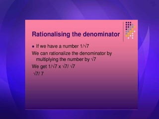 This document discusses different types of number systems. It begins by introducing natural numbers, which are counting numbers formed by repeated addition of 1. Whole numbers include all natural numbers and 0. Integers extend whole numbers infinitely in both the positive and negative directions. Rational numbers are numbers that can be written as fractions p/q where p and q are integers. Irrational numbers have non-repeating decimal expansions and cannot be written as fractions. Real numbers include all rational and irrational numbers and are represented on the number line. Methods for finding rational numbers between two given numbers and representing different types of numbers on the number line are also described.