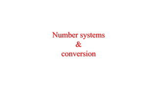 This document discusses different number systems including decimal, binary, and hexadecimal. It provides steps for converting between these number systems. Decimal to binary conversion is done using successive division by 2. Binary to decimal conversion multiplies each bit by its place value and sums the results. Binary to hexadecimal breaks the binary number into groups of 4 bits and maps each group to a hexadecimal digit. Hexadecimal to binary does the reverse. Decimal to hexadecimal converts each decimal digit to its hexadecimal equivalent. Hexadecimal to decimal multiplies each digit by its place value and sums the results.