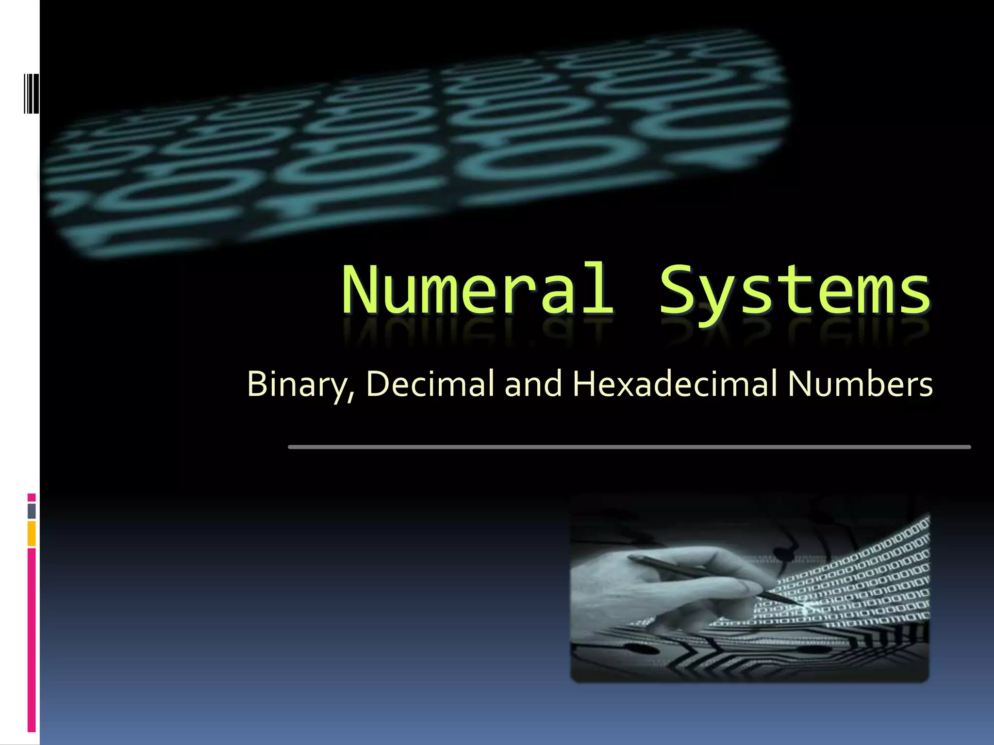 The document discusses different numeral systems used in computing including binary, decimal, octal and hexadecimal. It explains how each system uses a different base and symbol set. Binary uses base-2 with symbols 0-1. Decimal is base-10 with 0-9. Octal is base-8 with 0-7. Hexadecimal is base-16 with 0-9 and A-F. The document also provides examples and methods for converting between these different numeral systems that are commonly used for representing numbers, instructions and other data in computers.
