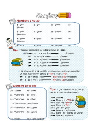 This document provides information about numbers from 1 to 20, and 20 to 100 in English and Spanish. It lists the numbers and their names. For numbers between 13 and 19, the names end in "teen". For numbers between 20 and 90, the names end in "ty" except for 30 which is "thirty". It also provides tips on forming the names of numbers in these ranges by combining individual digits.