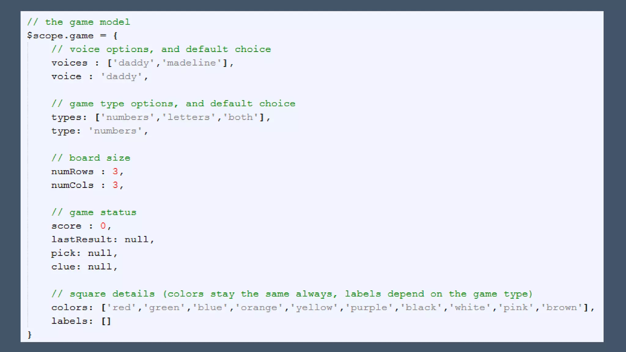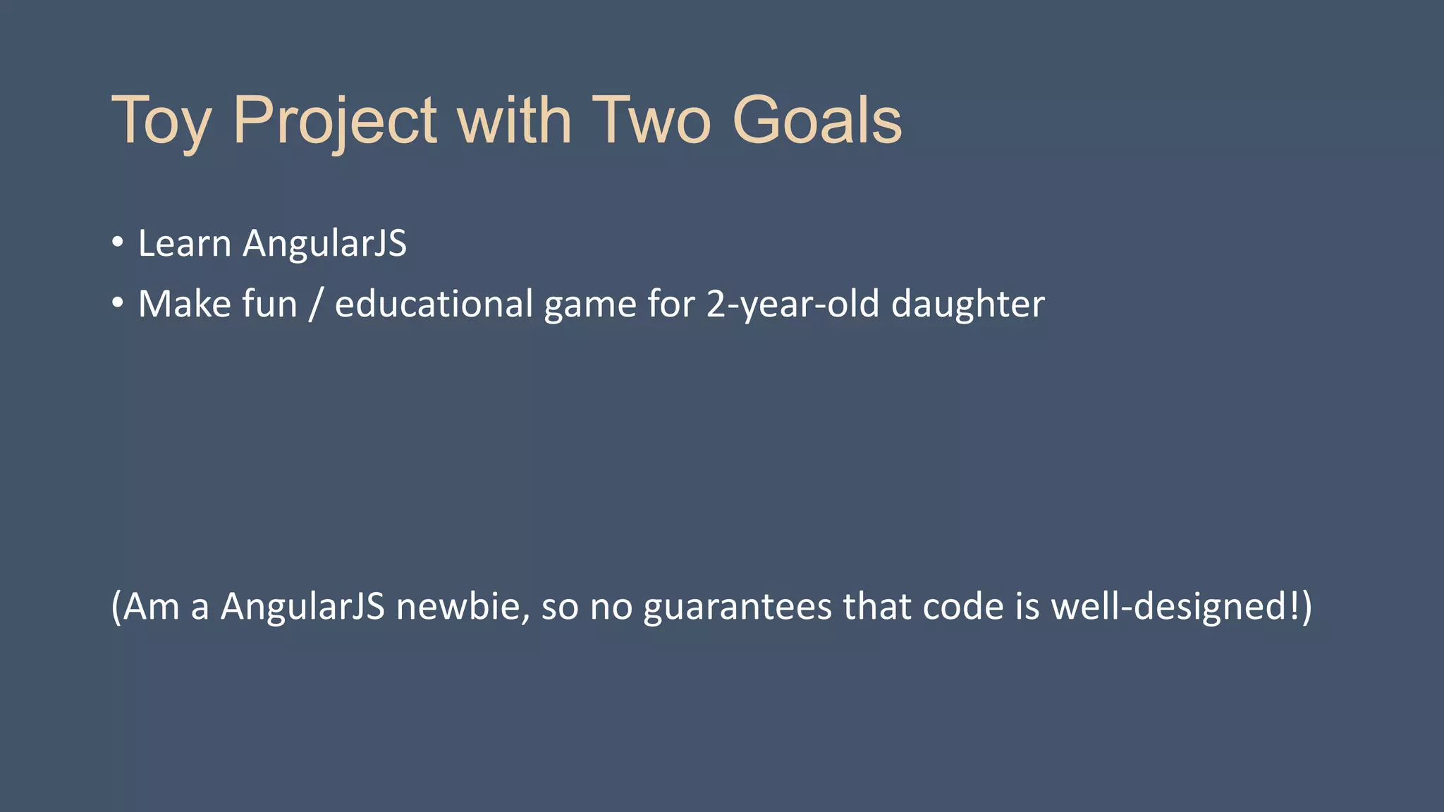 The document outlines a toy project by Joel Grus, aimed at creating a fun and educational numbers game for his 2-year-old daughter while learning AngularJS. The game features random permutations of colors and labels, with voice prompts indicating which to click and feedback on correctness. There are three game types focusing on numbers, letters, or a combination, and the code is available on GitHub.