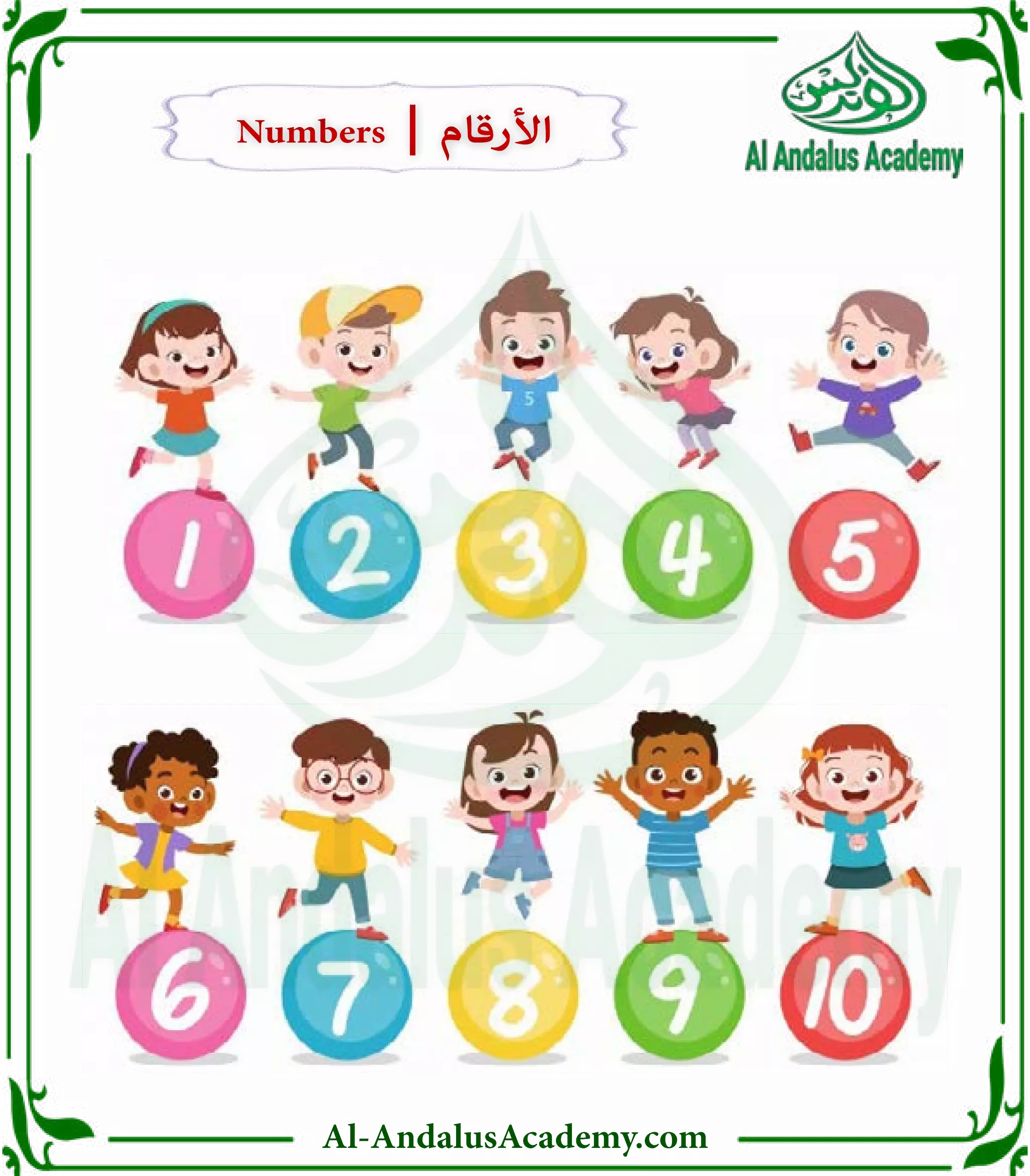 The document showcases numbers in Arabic and their corresponding English translations, listing them from one (1) to ten (10). Each number is presented alongside its Arabic numeral and phonetic representation. The resource appears to be educational, likely aimed at language learners.