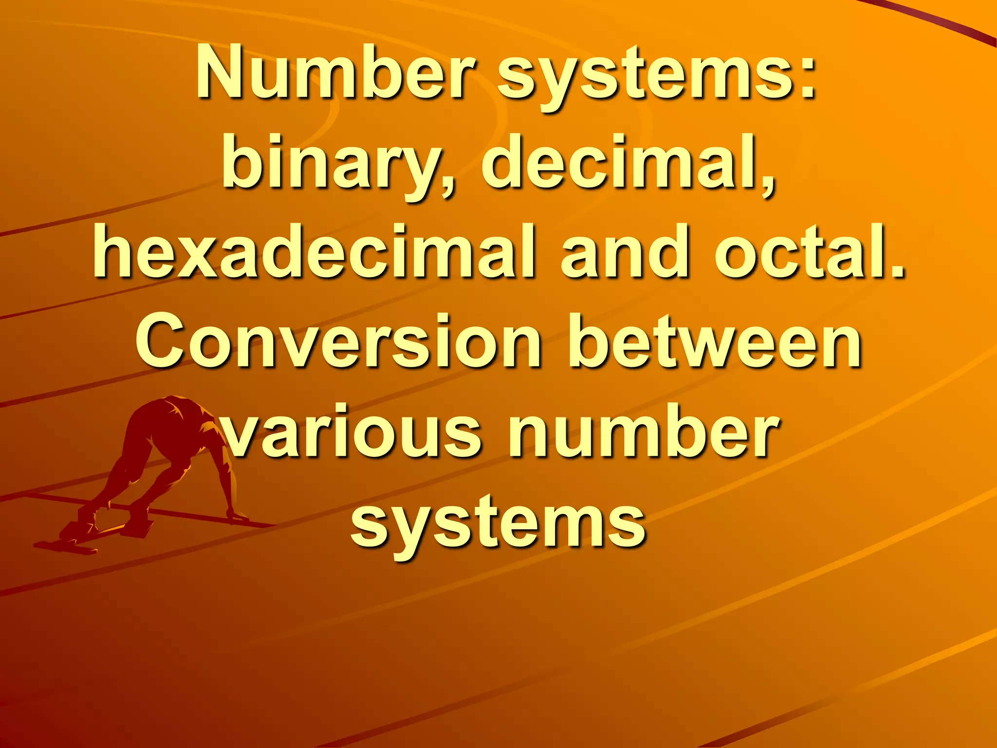 This document discusses different number systems including binary, decimal, hexadecimal, and octal. It provides details on: