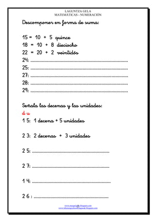 This document provides activities on number notation and numeration. It includes writing numbers from 0 to 29, decomposing numbers into sums of tens and ones, and writing numbers with decimals and units. Students are asked to write out numbers, decompose numbers into sums, and express numbers using decimals and units. The purpose is to practice different ways of writing and understanding numbers.